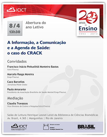 “A informação, a comunicação e a agenda da saúde: o caso Crack” será o tema de abertura do Ano Letivo de 2013 do Instituto de Comunicação e Informação Científica e Tecnológica em Saúde da Fundação Oswaldo Crus (Icict/Fiocruz), no próximo dia 8, às 14 horas.