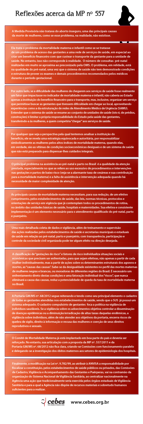 O CEBES posicionou-se contrariamente à aprovação desta MP, alinhando-se ao Conselho Nacional de Saúde, às feministas e à ABRASCO, entre outros setores da militância da saúde coletiva e dos direitos humanos. Era uma medida vertical e isolada, que pulveriza esforços e fragmenta o cuidado à saúde das mulheres, de maneira não condizente com uma política integral de saúde da mulher.