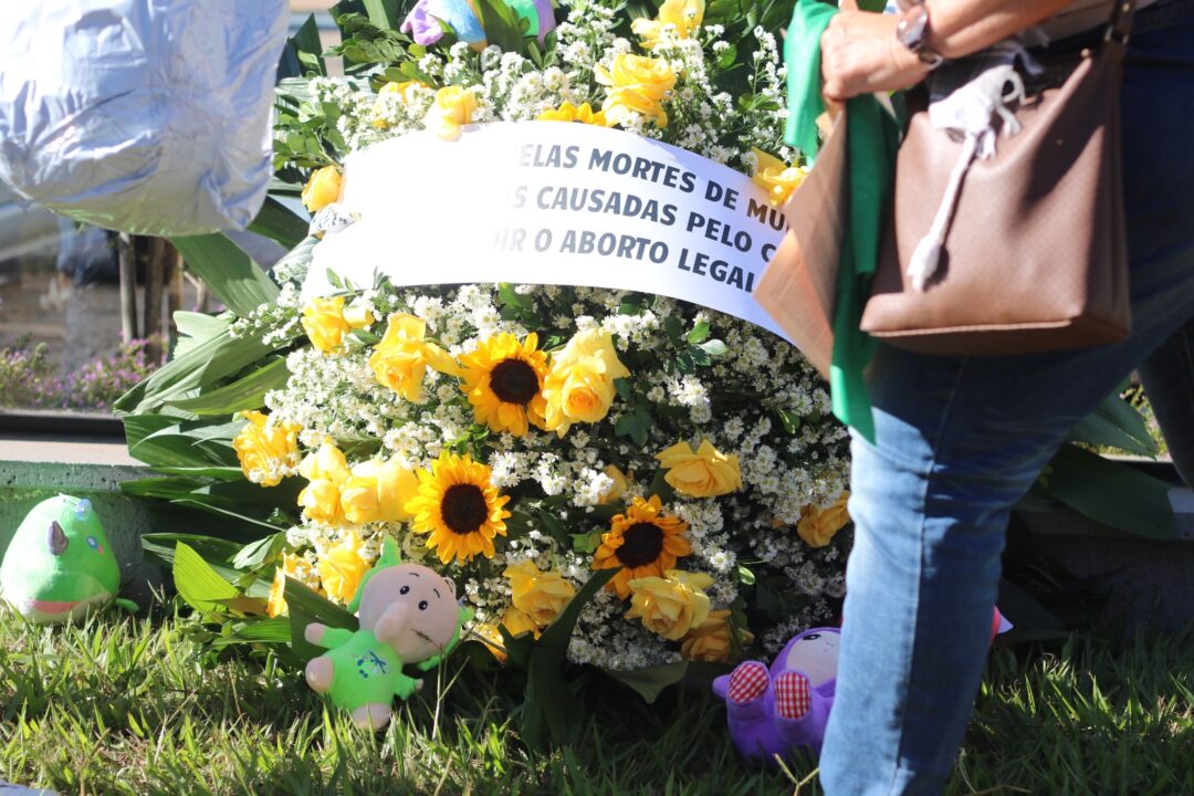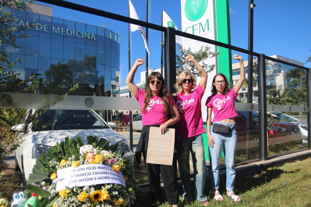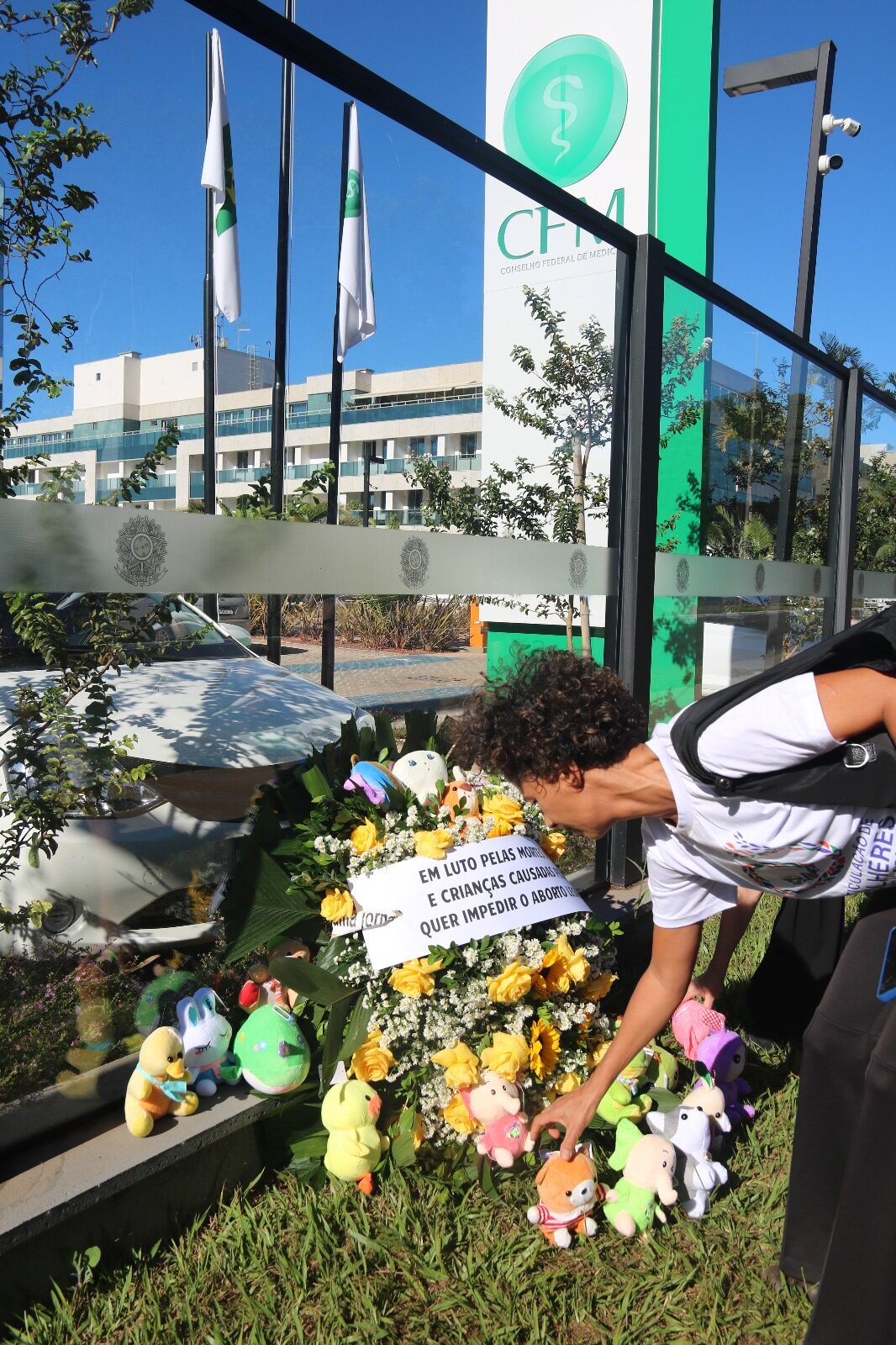 Coroa de flores com bichinhos de pelúcia marcou o luto pelas mulheres e meninas mortas por falta de assistência ao abortamento, em ato de repúdio ao Conselho Federal de Medicina (CFM), realizado hoje, 23/5, em Brasília. Suspensa liminarmente pelo Supremo Tribunal Federal (STF), a Resolução CFM 2378, que restringe a assistolia fetal, paralisou a assistência às vítimas de estupro a partir de 22 semanas gestacionais e aterrorizou equipes dos serviços de abortamento legal.