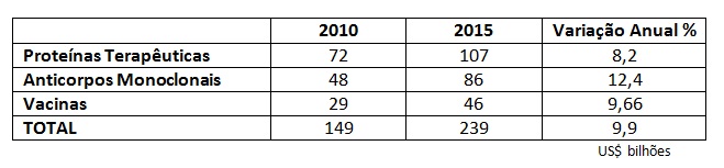 Os três principais grupos de produtos que compõem o segmento dos biológicos são as proteínas terapêuticas (insulina, somatotropina, enzimas corretivas de doenças genéticas, eritropoietina, interferons, etc.), os anticorpos monoclonais (mAbs) e as vacinas. A dinâmica do mercado de cada um deles entre 2010 e 2015 é apresentada na tabela. Os líderes de vendas são as insulinas e quatro dentre os mABS (BCC Research).