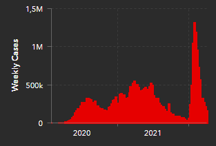 O pico de casos semanais no Brasil registrado por um dos índices mais baixos de testagem do mundo (2,9 pessoas por mil habitantes) foi relatado em fevereiro de 2022 com número de casos clínicos notificados de 1,25 milhão de casos por semana comparado a 500 mil casos por semana em agosto e setembro de 2021 (2,5 vezes maior), com aparente decréscimo até a última semana epidemiológica em 27 de março de 2022.