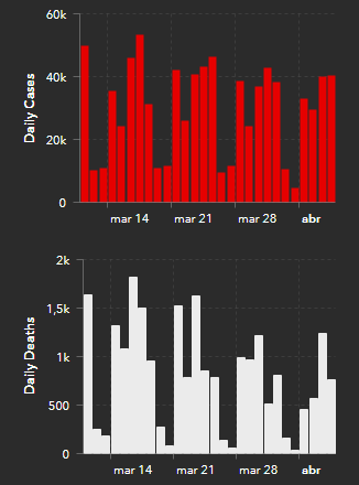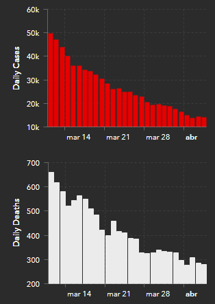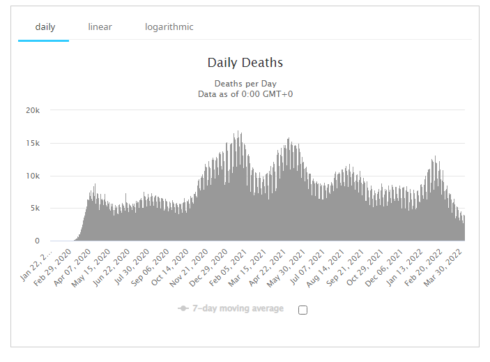 O número absoluto de mortes no Brasil até 27 de março foi de cerca de metade do pico de agosto de 2020 e quase um terço das mortes (6,1 mil) do pico mais alto de maio de 2021 (21,7 mil) por semana. O Brasil atingiu 661 mil mortes totais por covid-19 na Pandemia com 6,8 mil mortes a cada 28 dias.