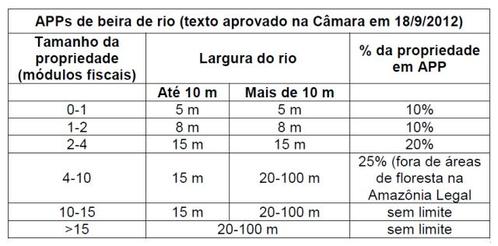 A obrigatoriedade de recuperar as APPs ciliares foi reduzida para médios e grandes produtores. A versão aprovada define que, em propriedades com mais de quatro módulos fiscais, será necessário recompor de 15 metros a 100 metros, sendo que o órgão ambiental estadual definirá, dentro desses limites, qual será a faixa de APP em rios com mais de dez metros de largura (veja tabela abaixo).