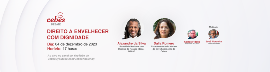 Para conversar sobre o direito a envelhecer com dignidade, o Cebes Debate recebe na próxima segunda-feira, dia 4 de dezembro, às 17:00hs, Alexandre da Silva, Secretário Nacional dos Direitos da Pessoa Idosa, do Ministério dos Direitos Humanos e da Cidadania (MDHC). Dalia Romero, Coordenadora do Núcleo Envelhecimento Saúde e Sociedade do Cebes (NESS/CEBES) participa da conversa, que será aberta por Carlos Fidelis, Presidente do Cebes e mediada por José Noronha.
