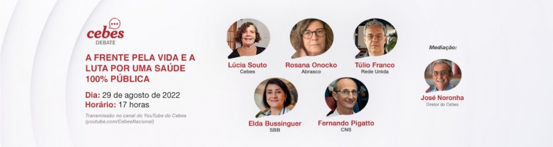 A luta pela saúde 100% pública, como direito universal e não mercadoria é prioridade estratégica das entidades que integram a Frente Pela Vida. No próximo programa Cebes Debate nós vamos aprofundar esta discussão tendo como referência as diretrizes da Frente pela Vida e a Carta compromisso entregues ao candidato a presidência Lula, na Conferência Nacional Livre, Democrática e Popular de Saúde, realizada em São Paulo. As presidentes do Cebes, Abrasco, SBB, o coordenador da Rede Unida e o presidente do Conselho Nacional de Saúde são nossos convidados. Nesta segunda-feira, dia 29 agosto, às 17h, no canal do Cebes, no youtube.