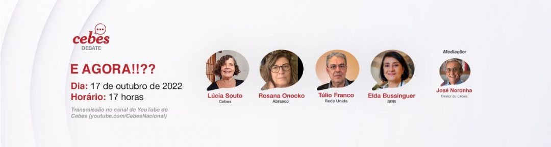 Na próxima segunda feira (31), o Cebes Debate tem um programa especial. Será o dia seguinte das eleições, já com o resultado de quem será o novo presidente deste país. Temos a firme convicção de que a civilização vai vencer a barbárie e a mentira. E para o debate neste programa histórico, estarão presentes os representantes do Cebes, Lúcia Souto, da Abrasco, Rosana Onoscko, da Rede Unida, Túlio Franco e da Sociedade de Bioética, Elda Bussinguer. Cebes Debate 31 de outubro de 2022 – 17h. No canal do YouTube do Cebes.