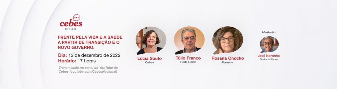 Nesta próxima segunda-feira (12), o programa Cebes Debate vai fazer uma abordagem das discussões durante o período de transição e os desafios para a saúde após a posse do presidente Lula, em primeiro de janeiro. Participam os presidentes do Cebes, Lúcia Souto, da Rede Unida, Túlio Franco e da Abrasco, Rosana Onocko. Cebes Debate, 12 de dezembro, às 17h no canal do YouTube do Cebes.