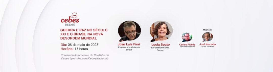 O programa Cebes Debate da próxima segunda-feira (08 de maio) recebe o professor José Luis Fiori para falar sobre guerra e paz no século XXI e o Brasil na nova desordem mundial. O programa terá também a participação do presidente do Cebes, Carlos Fidelis, e da ex-presidenta Lúcio Souto. A moderação é de José Noronha. Cebes Debate, segunda-fera (8) às 17h no canal do Cebes no YouTube.