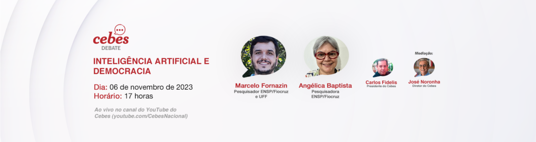 A Inteligência Artificial ameaça ou fortalece a Democracia? E a Soberania? E no Brasil? Para essa conversa o Cebes Debate recebe o Pesquisador da Escola Nacional de Saúde Pública Sergio Arouca da Fiocruz (ENSP/Fiocruz) e da Universidade Federal Fluminense Marcelo Fornazin, que tem se dedicado às múltiplas dimensões da Saúde Digital. Com ele dialogará Angélica Baptista, também Pesquisdora da ENSP/Fiocruz, que também tem trabalhado nessa área, com ênfase na bioética. Carlos Fidelis, Presidente do Cebes abre a conversa, que será mediada por José Noronha. Na próxima segunda-feira, dia 6, às 17:00hs, no YouTube do Cebes.