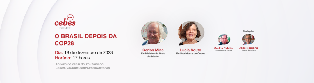 Para fazer um balanço da participação do Brasil e as obrigações que teremos até a realização da COP 30 em Belém em 2025, o Cebes Debate recebe na próxima segunda feira, dia 18, às 17:00hs, o Deputado Estadual do Rio de Janeiro Carlos Minc, ex-Ministro do Meio Ambiente do Governo Lula 2. Lucia Souto, Ex-Presidenta do Cebes e atualmente Chefe da Assessoria de Participação Social e Diversidade do Ministério da Saúde, participa da conversa, que será aberta por Carlos Fidelis, Presidente do Cebes, e mediada por José Noronha.