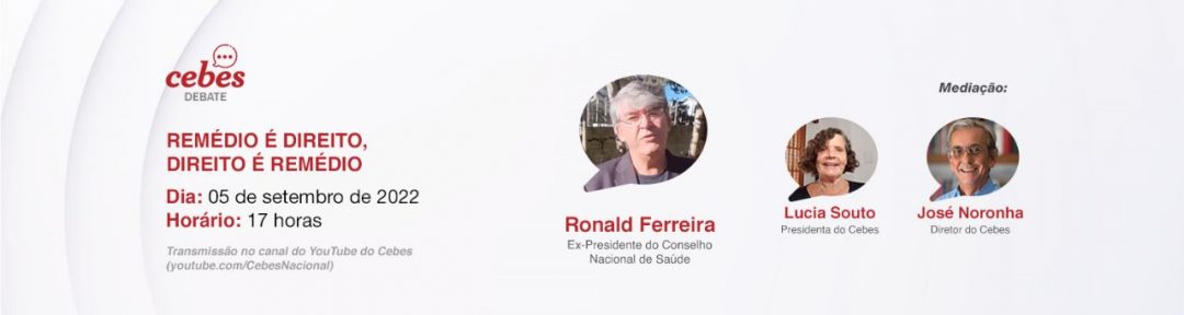 No próximo programa Cebes Debate vamos discutir o desafio de ampliar a distribuição de remédios do SUS para toda a população. O setor público (SUS) só participa com 10% do total dos gastos das famÃlias com medicamentos E o gasto com remédios onera desproporcionalmente as famÃlias mais pobres, que comprometem uma proporção muito maior de seus orçamentos familiares com medicamentos. Temos que fazer a assistência farmacêutica chegar de fato ao SUS. Remédio é Direito. Quem vai estar conosco nesta conversa é Ronald Ferreira dos Santos, Diretor da Federação Nacional dos Farmacêuticos e ex-presidente do Conselho Nacional de Saúde. Nesta segunda-feira (05 set), à s 17h no canal do Cebes do Youtube.