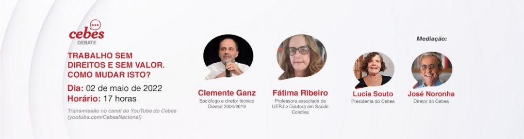 O Cebes Debate desta segunda feira (02) vai abordar as perspectivas para o trabalho na contemporaneidade. Como convidados, o Sociólogo Clemente Ganz e a Doutora em Saúde coletiva, Fátima Ribeiro.