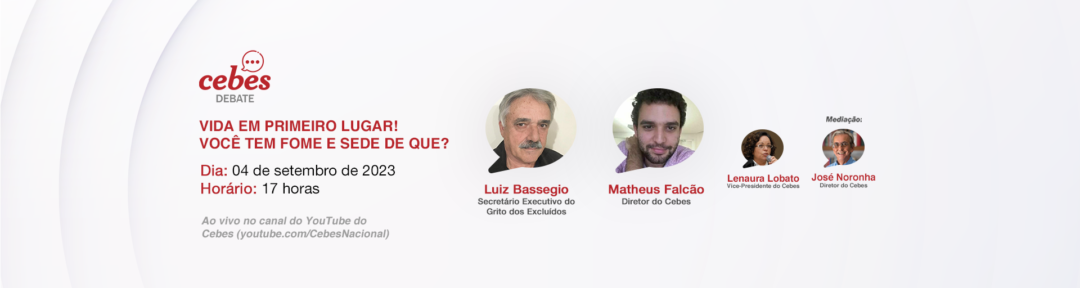 O Grito dos Excluídos e Excluídas prepara sua 29ª ação nesse ano de 2023 com o lema “Você tem fome e sede de quê?” com sua primeira coletiva de imprensa na segunda-feira, dia 4 de setembro às 10:00hs. Às 17:00hs o Cebes Debate estrará recebendo Luis Bessagio, Secretário Executivo Continental do Grito dos Excluidos para conversar conosco sobre o tema deste ano e sobre a mobilização em torno da convocação da Conferência Nacional Popular pela Democracia, Paz, Desenvolvimento com Justiça Social e Justiça Ambiental. Matheus Falcão, Diretor do Cebes, participará da conversa que será aberta por Lenaura Lobato, nossa Vice-Presidente. José Noronha será o mediador.