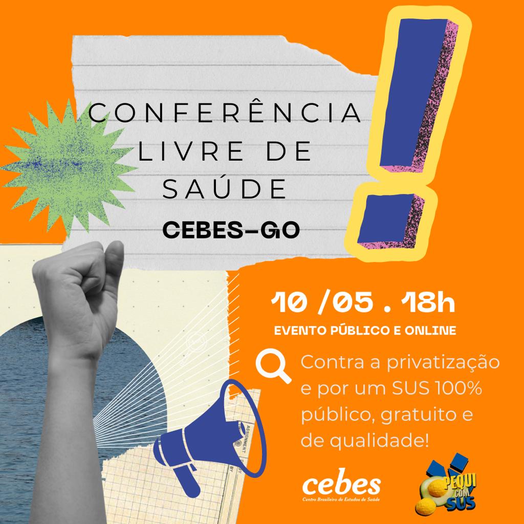 O núcleo Goiânia do Cebes promove no dia 10 de maio a etapa local da Conferência Livre de Saúde. O evento, que será integralmente on-line, terá como tema “O Brasil e a Saúde que queremos!” em defesa de um SUS 100% público, gratuito, estatal e de qualidade! Começa às 18h.