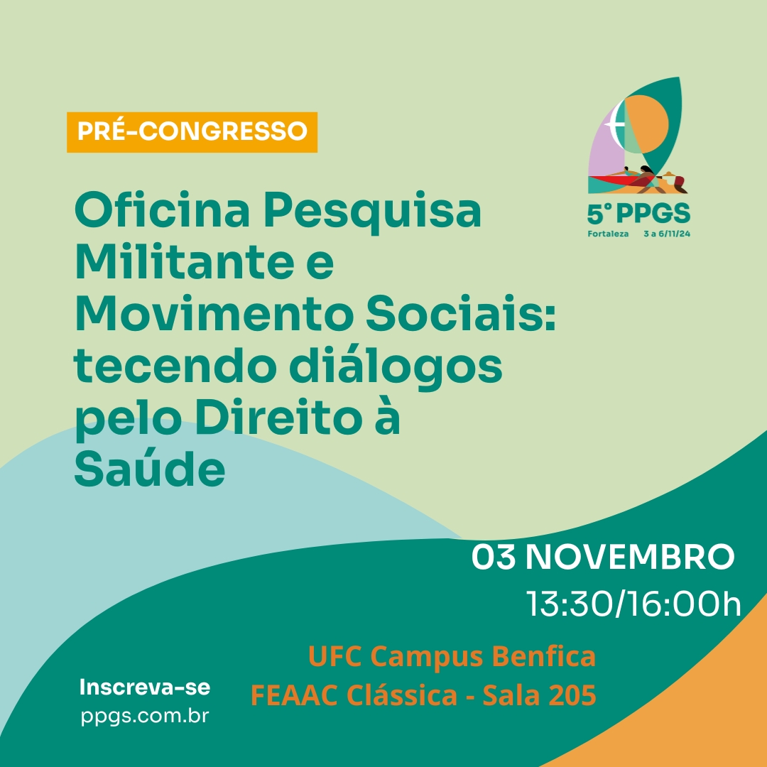 No dia 03/09, de 13h30 às 16h, promove Oficina Pesquisa Militante e Movimentos Sociais: tecendo diálogos pelo Direito à Saúde. Local: UFC Campus Benfica | FEAAC Clássica Sala 205.