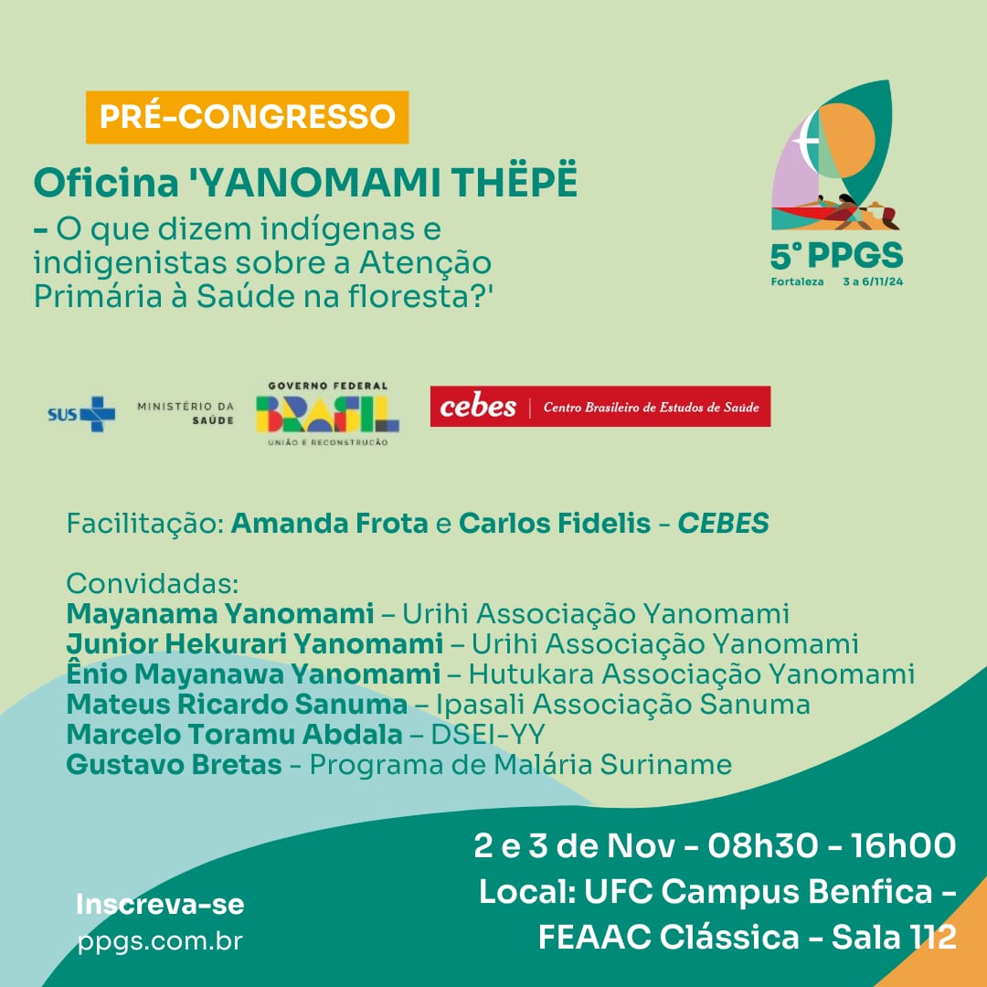 De 02/09 às 03/09, de 08h30 às 16h, promove a Oficina ‘YANOMAMI THËPË – o que dizem indígenas e indigenistas sobre a Atenção Primária à Saúde na floresta?’. Local: UFC Campus Benfica – FEAAC Clássica – Sala 112.