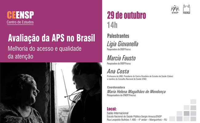 A Atenção Primária à Saúde (APS) é entendida como um conjunto de intervenções de saúde no âmbito individual e coletivo que envolve promoção, prevenção, diagnóstico, tratamento e reabilitação respondendo, de forma regionalizada, contínua e sistematizada, a maior parte das necessidades de saúde de uma população. O próximo Centro de Estudos Miguel Murat da ENSP debaterá justamente isto. Com o tema Avaliação da APS no Brasil – melhoria do acesso e da qualidade da atenção, a atividade está marcada para o dia 29 de outubro, às 14 horas, no salão internacional, reunindo as pesquisadoras da Escola Ligia Giovanella e Marcia Fausto, e a presidente do Cebes, Ana Costa. O Ceensp é aberto a todos os interessados e não é necessária inscrição prévia.