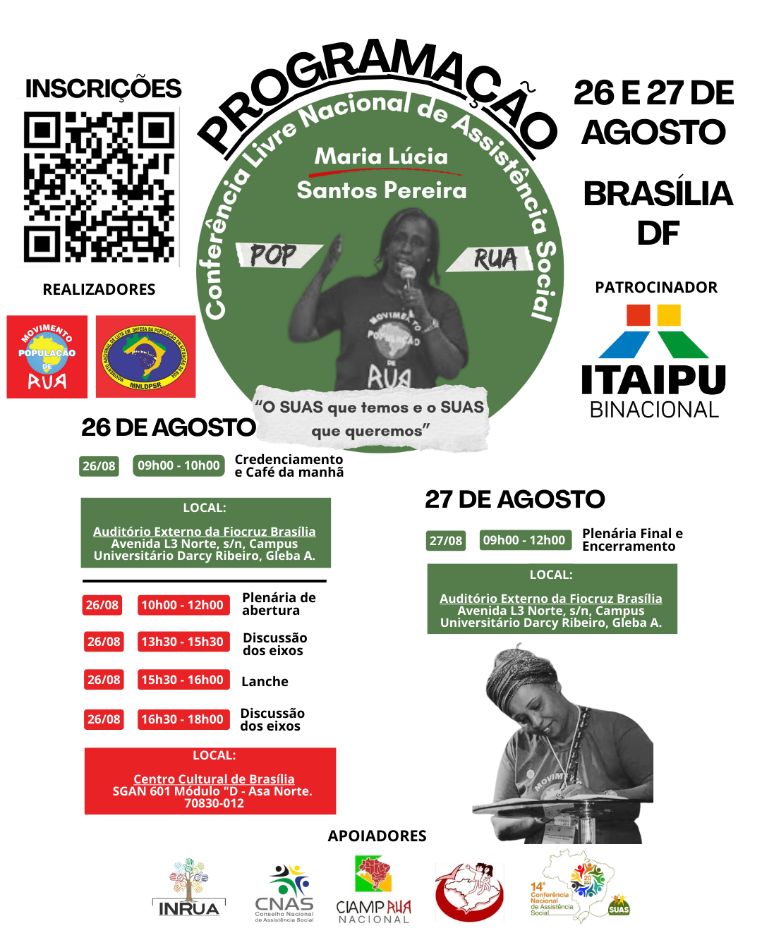 A Conferência é uma realização do Movimento População de Rua, Movimento Nacional de Luta em Defesa da População em Situação de Rua (MNLDPSR) com apoio do Centro Brasileiro de Estudos de Saúde (Cebes), o Comitê Intersetorial de Acompanhamento e Monitoramento da Política Nacional para a População em Situação de Rua (CIAMP-Rua), Conselho Nacional de Assistência Social (CNAS), Instituto Nacional de Direitos Humanos da População em Situação de Rua (INRUA) e da 14a Conferência Nacional de Assistência Social. Patrocínio da Itaipu Binacional.
