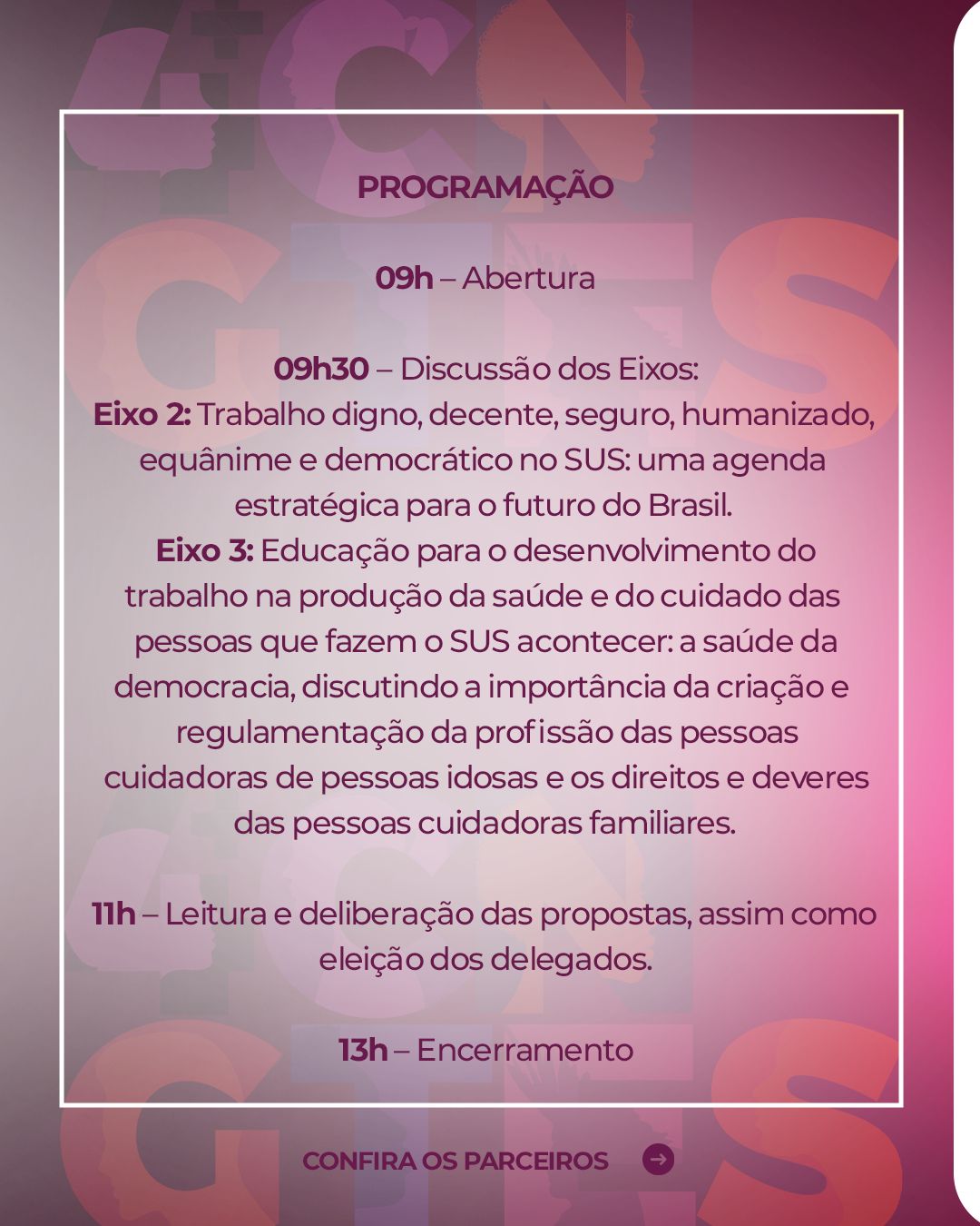 A conferência também servirá como etapa preparatória para a 4ª Conferência Nacional de Gestão do Trabalho e da Educação na Saúde (CNGTES) que será realizada no período de 10 e 13 de dezembro de 2024, em Brasília. pelo Conselho Nacional de Saúde.