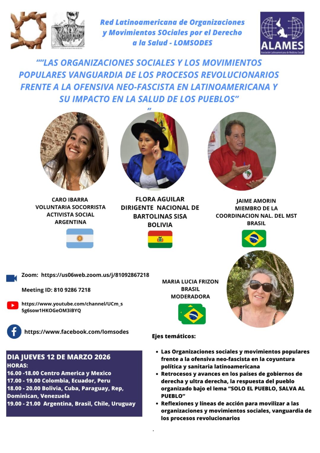 A Red Latinoamericana de Organizaciones y Movimientos Sociales por el Derecho a la Salud (RED LOMSODES) realiza no dia 12/03 o Primeiro Conversatório da Gestão 2025–2027, com o tema: “As organizações sociais e os movimentos populares como vanguarda dos processos revolucionários frente à ofensiva neofascista na América Latina e seus impactos na saúde dos povos”.