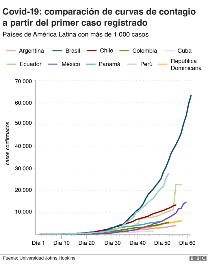 Curiosamente, sin embargo, el segundo país en número de casos y por ritmo de contagio es Perú, que también fue uno de los primeros en reaccionar con estrictas medidas de confinamiento.