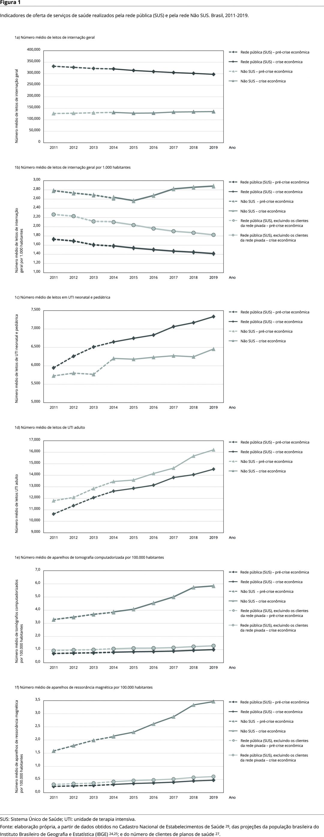 Embora os princípios de universalidade e gratuidade do SUS estejam mantidos constitucionalmente, no período de crise aprofundou-se a discrepância entre produção e oferta de serviços de saúde públicos e privados, com destaque para a redução do número de consultas e do número de leitos no SUS. A análise do número total de leitos por mil habitantes no Brasil aponta uma tendência de redução que antecede a crise (2,4 em 2011; 2,2 em 2014; e 2,1 em 2019), tal como ocorrido no Reino Unido, que apresentou redução da proporção de leitos per capita entre 2000 e 2013 (4,1 leitos por mil habitantes em 2000; 3,3 em 2008; e 2,7 em 2014), e nos Estados Unidos no mesmo período (3,5 leitos por mil habitantes em 2000; 3,1 em 2008; e 2,8 em 2014) 1.