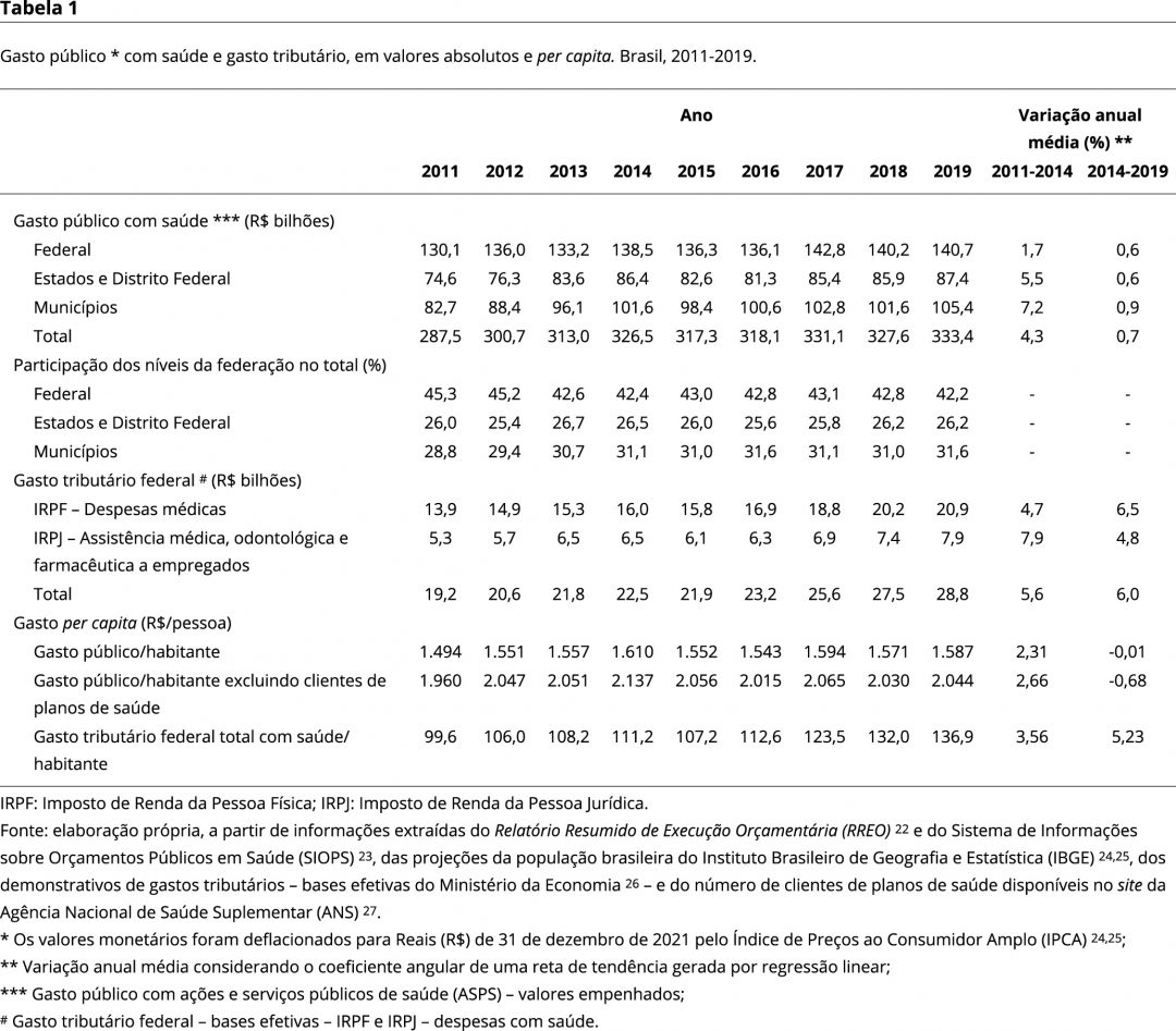 Gastos federais foram obtidos do Relatório Resumido de Execução Orçamentária (RREO) do Governo Federal 22. Despesas estaduais e municipais foram extraídas do Sistema de Informações sobre Orçamentos Públicos em Saúde (SIOPS) 23. O gasto público total representa a soma dos três níveis. Os gastos per capita foram calculados dividindo o total pelas respectivas estimativas da população brasileira para 1º de julho de cada ano analisado, com base no Instituto Brasileiro de Geografia e Estatística (IBGE) 24,25. Os gastos tributários com saúde tiveram como fontes os demonstrativos de gastos tributários – bases efetivas do Ministério da Economia 26 -, nos quais foram selecionadas as rubricas “despesas médicas”, do Imposto de Renda da Pessoa Física (IRPF), e “assistência médica, odontológica e farmacêutica a empregados”, do Imposto de Renda da Pessoa Jurídica (IRPJ).