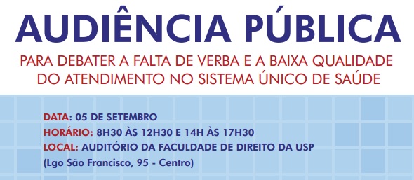 Audiência Pública sobre o subfinanciamento da saúde pública no dia 5 de setembro, de 8h às 18h, no auditório nobre da Faculdade de Direito da Universidade de São Paulo (USP).