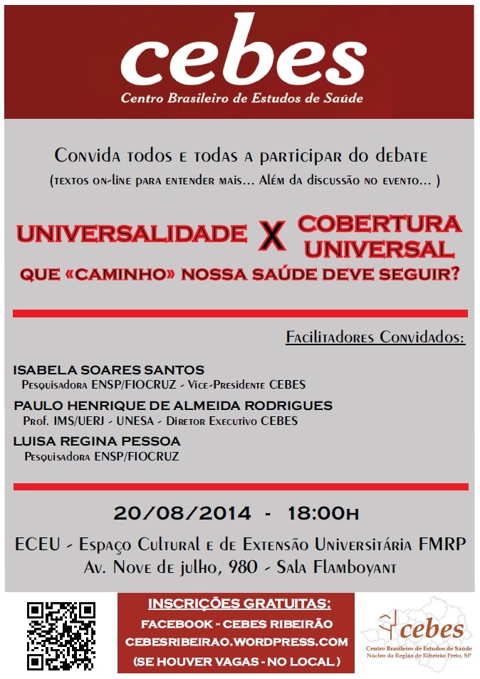 O Núcleo Cebes Ribeirão Preto (SP) promove curso nesta quarta-feira (20) sobre o tema “Universalidade x Cobertura Universal”. O evento é gratuito.