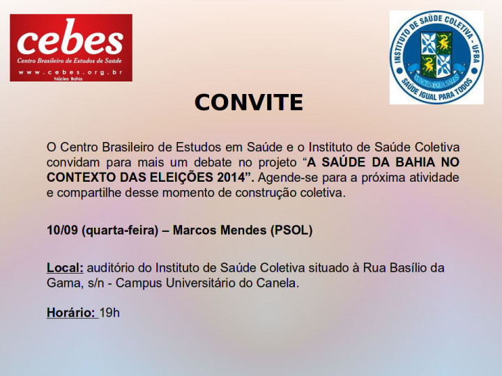 Cebes Bahia e Instituto de Saúde Coletiva convidam a todos para debate sobre a Saúde nas eleições de outubro.
