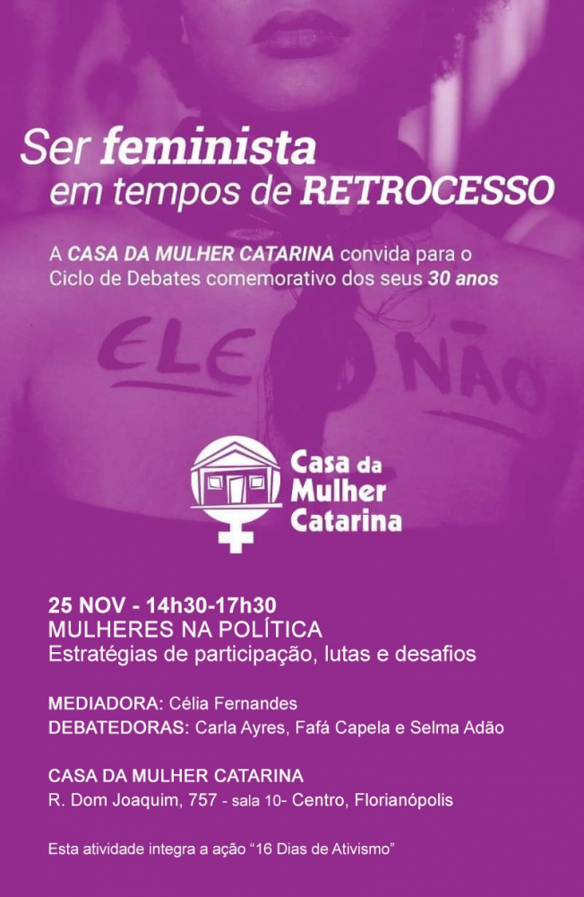 A Casa da Mulher Catarina convida todas para o debate sobre “Mulheres na Política – Estratégias de participação, lutas e desafios”, com as companheiras Célia Fernandes, Carla Ayres, Fafá Capela e Selma Adão. A mesa faz parte do Ciclo de Debates “Ser feminista em tempos de retrocesso” comemorativos aos 30 anos do grupo e está integrada aos 16 dias de ativismo contra a violência contra a mulher.