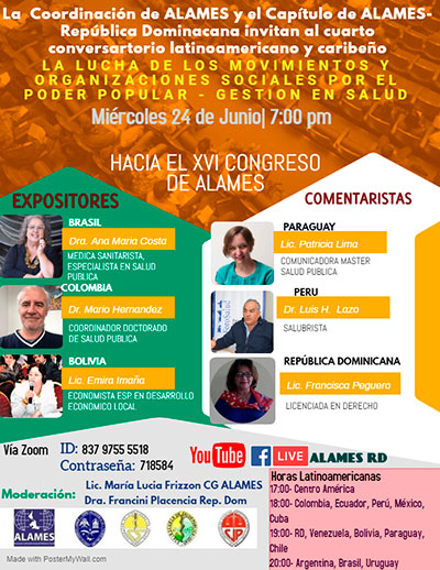 A Asociación Latinoamericana de Medicina Social (ALAMES) convida todas e todos a participar da quarta conversa latinoamericana e caribenha nessa quarta-feira às 20h (horário de Brasília). O tema será “A luta dos movimentos e organizações sociais pelo poder popular – gestão em Saúde”.