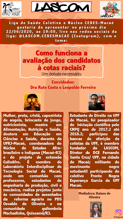 O núcleo do CEBES em Macaé-RJ em conjunto com a Liga Acadêmica de Saúde Coletiva (LASCOM) vai promover no dia 22 de junho (segunda-feira) às 19h uma live com o tema “Como funciona a avaliação dos candidatos à cotas raciais? Um debate necessário”. Segundo organizadores, o evento foi pensado devido às “massivas denúncias de fraudes em cotas raciais nos cursos da Universidade Federal do Rio de Janeiro (UFRJ) e Universidade Federal Fluminense (UFF) campus Macaé”.