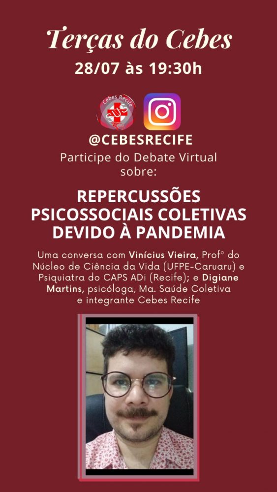O núcleo Recife do CEBES convoca essa terça-feira (28) às 19h30 para o bate papo com o professor e psiquiatra Vinícius Vieira sobre a saúde mental da população durante a pandemia e a situação da rede de saúde mental de Recife. O tema é “Repercussões Psicossociais Coletivas devido à Pandemia”
