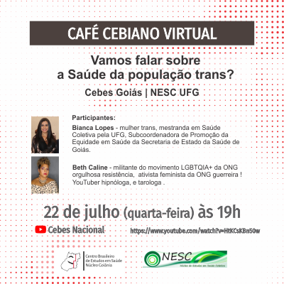 O núcleo Goiás do Centro Brasileiro de Estudos de Saúde (CEBES) promove em parceria com Núcleo de Estudos em Saúde Coletiva da Universidade Federal de Goiás o (NESC UFG) o Café Cebiano Virtual com o tema “Vamos falar sobre a Saúde da população trans?”. O debate será no dia 22 de julho, quarta-feira, às 19h.