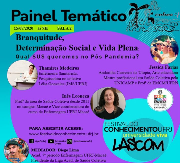 Nós, do Cebes-Macaé e Liga Acadêmica de Saúde Coletiva (LASCOM) anunciamos com imenso prazer nosso Painel Temático “Branquitude, Determinação Social e Vida Plena: Qual o SUS queremos no pós pandemia?”