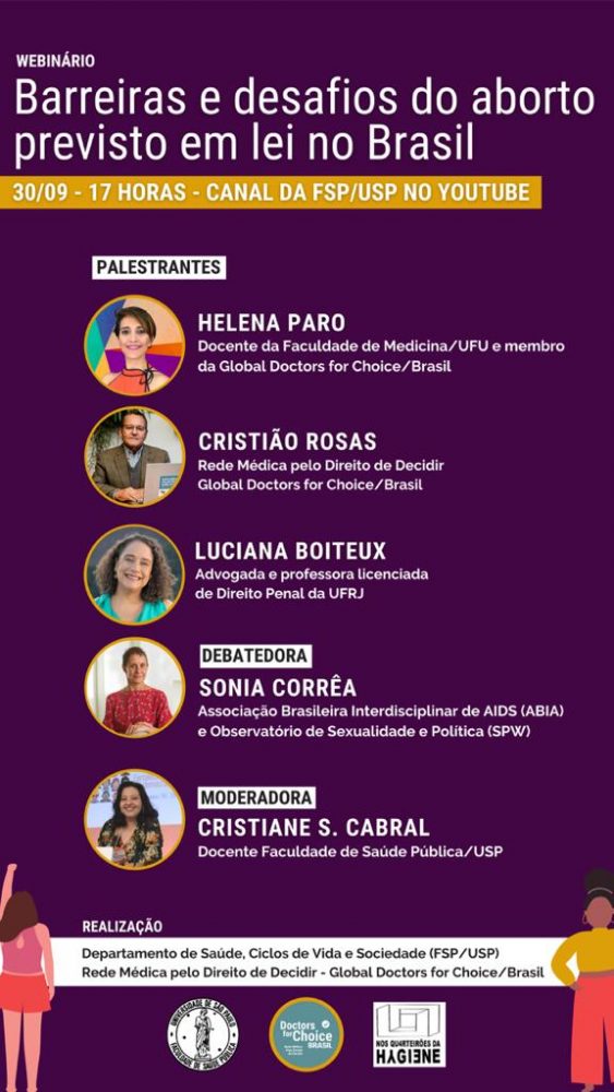 Essa quarta-feira dia 30/09 às 17h vai acontecer o webinário Barreiras e desafios do aborto previsto em lei no Brasil. O evento está sendo promovido pelo Departamento de Saúde, Ciclos de Vida e Sociedade (FSP)/USP e Rede Médica pelo Direito de Decidir – Global Doctors for Choice/Brasil.
