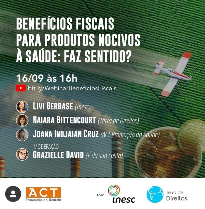 A Aliança de Controle do Tabagismo (ACT Promoção da Saúde) promove no dia 16/09 às 16h o webinar “Benefícios Fiscais para Produtos Nocivos à Saúde: Faz Sentido?”. O evento conta com apoio do Instituto de Estudos Socioeconômicos (Inesc) e Terra de Direitos.