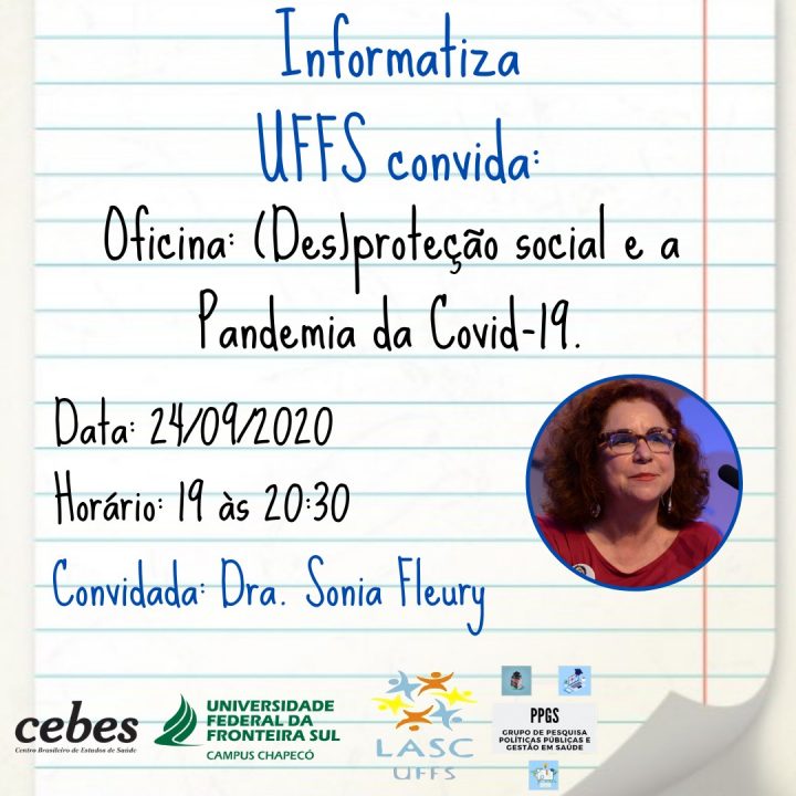 No dia 24 de setembro às 19h acontecerá a Oficina (Des) Proteção Social e a Pandemia da Covid-19. O evento está sendo organizado pelo Grupo de Pesquisas em Políticas Públicas e Gestão em Saúde (PPGS) da Universidade Federal da Fronteira Sul (UFFS), Liga Acadêmica de Saúde Coletiva (LASC) e Centro Brasileiro de Estudos em Saúde (CEBES) – Núcleo Chapecó/SC, a partir de um projeto de extensão universitária: Informatiza UFFS: o que eu preciso saber sobre o SUS e a COVID-19.