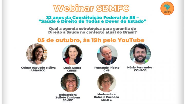 Em comemoração dos 30 anos da regulamentação do SUS, por meio da lei 8080/90, a Sociedade Brasileira de Medicina de Família e Comunidade (SBMFC) promove o Webinar 32 anos da Constituição Federal de 88 – “Saúde é Direito de Todos e Dever do Estado”. O debate será dia 5 de outubro, a partir das 19h, com transmissão ao vivo pelo YouTube da SBMFC, com abordagem do tema “Qual a agenda estratégica para garantia do Direito à Saúde no contexto atual do Brasil?”, e contará com a presença de Lúcia Souto, presidenta do Centro Brasileiro de Estudos de Saúde (CEBES) e representantes de entidades de relevância nacional na luta e defesa do SUS.