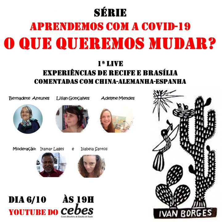 O Centro Brasileiro de Estudos de Saúde (CEBES) convida para a série: “Aprendemos com a Covid-19 – O que queremos mudar?”, um bate-papo virtual que compõe uma série de conversas promovidas com cebianos sobre como diferentes lugares que estão fazendo o enfrentamento ao coronavírus e o que dá tempo de fazer para este final de ano e a partir de 2021, após eleitas as novas prefeituras e vereanças. Nessa primeira Live da série, que acontece essa terça-feira (06/10) às 19h, serão debatidas as experiências nacional de Recife e de Brasília com comentários acerca do cenário internacional incluindo China, Alemanha e a Espanha. A conversa conta com a participação de Bernadete Antunes, Lilian Gonçalves, Adelyne Mendes, tendo mediação de Isabela Santos e Itamar Lages.