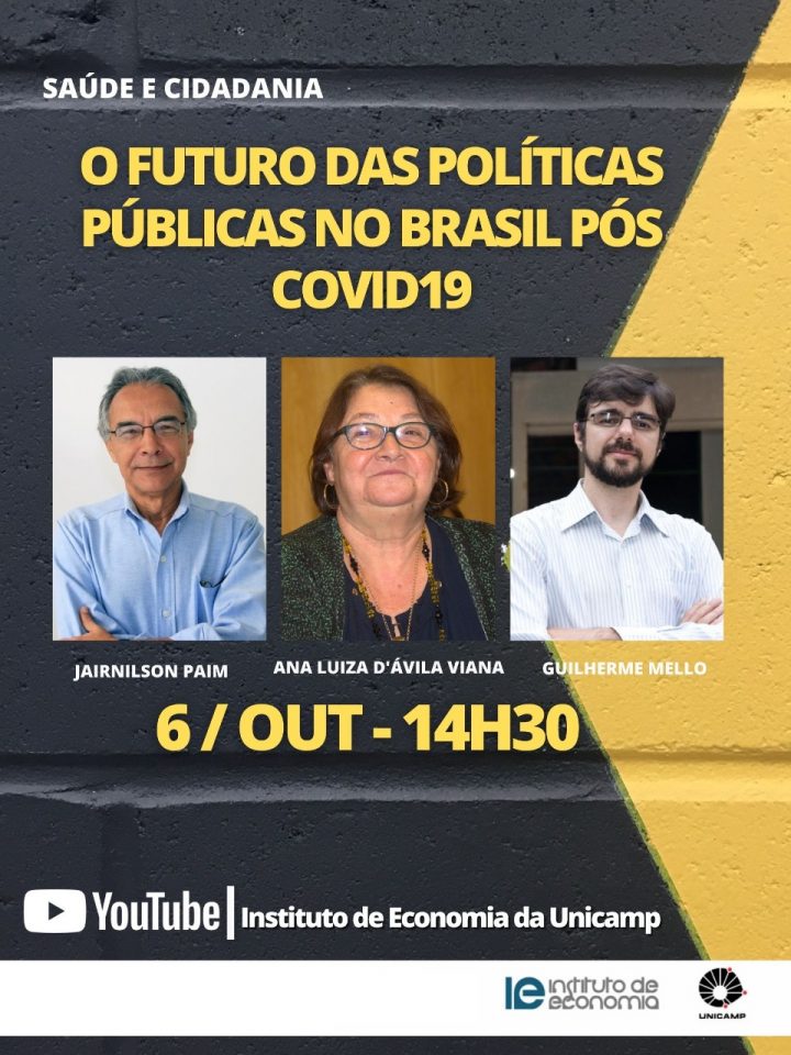O Instituto de Economia da Unicamp convida para o painel “O futuro das políticas públicas de saúde no Brasil pós Covid19”, o terceiro de uma série de atividades sobre o desempenho do Sistema Único de Saúde (SUS) e da economia brasileira no período de pandemia. O painel será no dia 06 de outubro (terça-feira) às 14h30.