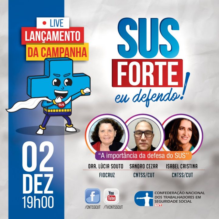 A Confederação Nacional dos Trabalhadores em Seguridade Social (CNTSS/CUT) promove nesse dia 02 de dezembro às 19h o lançamento da campanha “SUS Forte Eu Defendo!”. O evento vai contar com o a conversa “A Importância da Defesa do SUS”, com a participação da presidenta do Centro Brasileiro de Estudos de Saúde (Cebes) Lúcia Souto, além de Sandro Cezar e Isabel Cristina, integrantes da CNTSS/CUT.