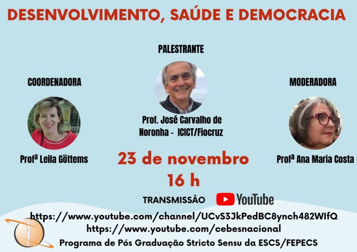 Nesse dia 23 às 16h o Programa de Pós-Graduação Stricto Sensu da Escola Superior de Ciências da Saúde, integrante da Fundação de Ensino e Pesquisa em Ciências da Saúde (ESCS/FEPECS) promove o webinar Desenvolvimento, Saúde e Democracia. O evento contará com a participação dos cebianos José Carvalho de Noronha (ICIT/Fiocruz) e a moderadora Ana Maria Costa. A Coordenação será de Leila Göttems.