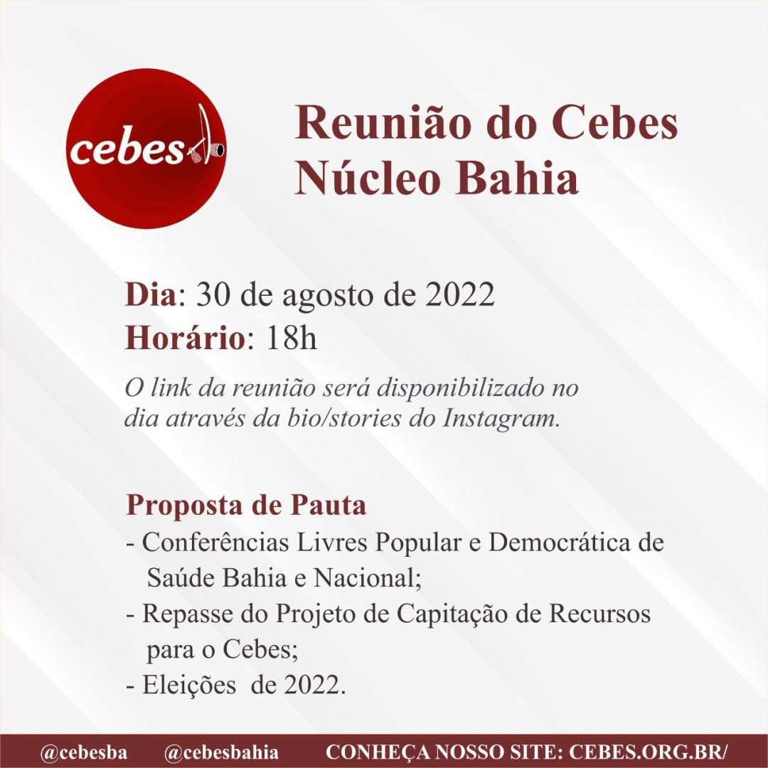 ago 29 2022 Núcleo Bahia do Cebes convida para debate Conferência Livre, Eleições e projetos para a entidade
