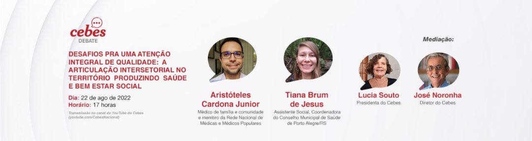 Nesta próxima segunda-feira (22/08), o programa Cebes Debate vai abordar um tema importante no cuidado do atendimento. Convidamos um médico de família e comunidade, Aristóteles Cardona e uma assistente social, Tiana Brum de Jesus, para reponderem aos desafios de como aprofundar a articulação intersetorial entre os vários agentes da saúde, na perspectiva de produzir um cuidado integral e de qualidade no território. Cebes Debate, nesta segunda – 25 de agosto, 17h.