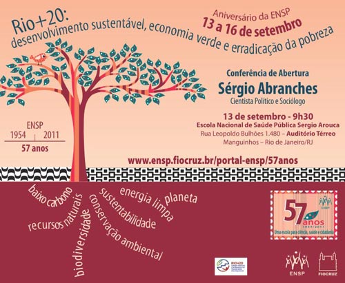 A Escola Nacional de Saúde Pública Sergio Arouca (ENSP/Fiocruz) comemora, de 13 a 16 de setembro, 57 anos discutindo o tema Rio+20: desenvolvimento sustentável, economia verde e erradicação da pobreza. O evento principal será a conferência com o sociólogo e cientista político Sérgio Abranches no dia 13 de setembro, às 9h30, no auditório térreo da Escola, não sendo necessária inscrição prévia. A semana será aberta aos interessados, com atividades científicas e culturais voltadas para profissionais, alunos e a comunidade de Manguinhos.