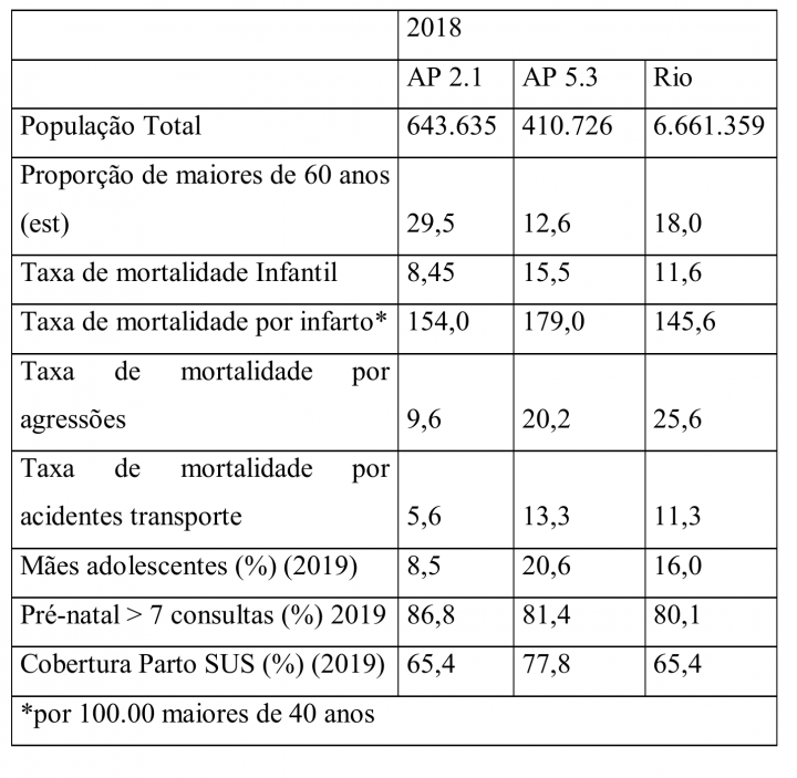 Segundo o Instituto Pereira Passos na Saúde, como em outros espaços, o Rio contém muitos Rios. Rios muitas vezes vizinhos exibem largas diferenças de vida. Barra da Tijuca e Cidade de Deus, por exemplo, estão coladas no mapa, mas distantes em seus territórios. Em 2014, a taxa de mortalidade infantil na Cidade de Deus foi 2,6 vezes maior do que na Barra (22 contra 8 óbitos por mil nascidos vivos). Enquanto na Barra cerca de 15% das gestantes tinha feito menos de 7 consultas pré-natais (padrão de referência), na Cidade de Deus essa proporção foi de 43%. As diferenças entre a Zona Sul e a região de Santa Cruz são muito gritantes (Quadro 1).
