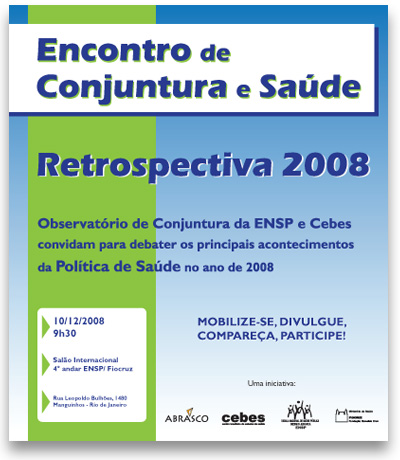 O Observatório de Conjuntura da Política de Saúde da ENSP e o Cebes convidam para debater os principais acontecimentos da Política de Saúde no ano de 2008. O Encontro de Conjuntura e Saúde, cujo tema será “Retrospectiva 2008”, será realizado no dia 10 de dezembro de 2008, às 9h30, no Salão Internacional da Escola Nacional de Saúde Pública Sergio Arouca, na cidade do Rio de Janeiro.