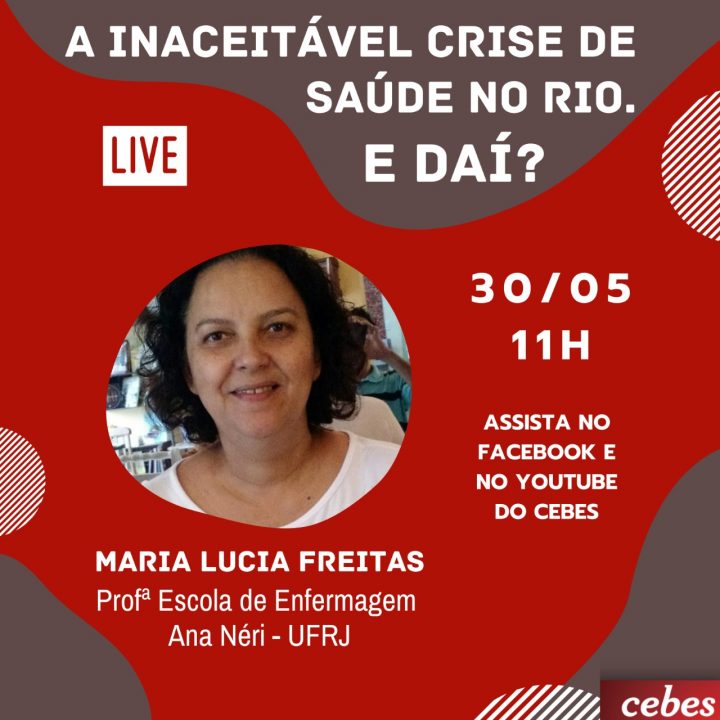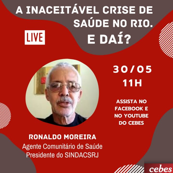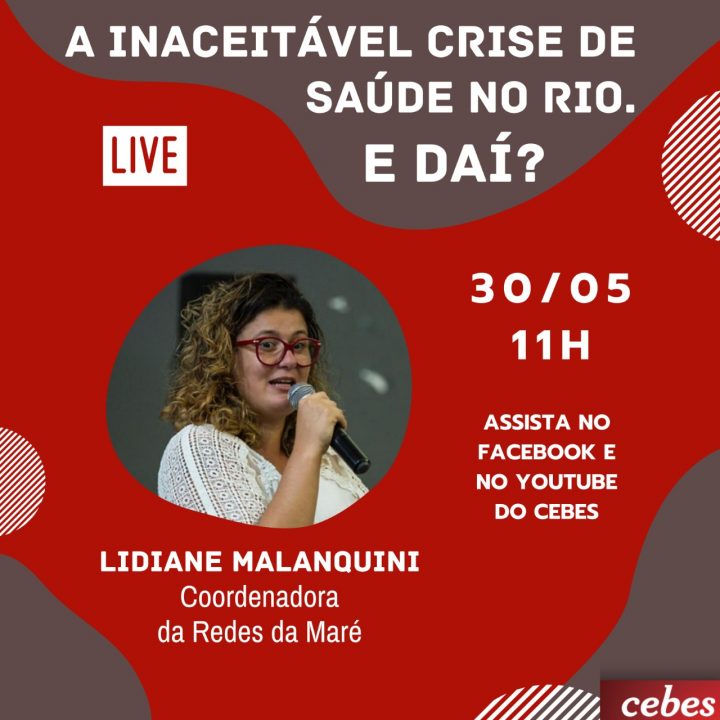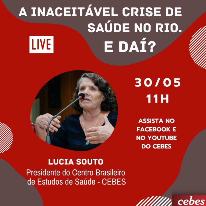 Esse sábado (30/05) a presidenta do CEBES Lúcia Souto vai participar do debate online “A Inaceitável crise de saúde no Rio de Janeiro“. Ele será exibido online às 11h nos canais de youtube e facebook do CEBES. Vão participar: Rodrigo Oliveira, secretário de Saúde de Niterói, Lidiane Malanquini, coordenadora do eixo de Segurança Pública e Acesso à Justiça da Redes da Maré – está à frente do trabalho de acesso à saúde da organização durante a pandemia -, Ronaldo Oliveira, Agente Comunitário de Saúde e presidente do Sindicato dos Agentes Comunitário de Saúde do Município do Rio de Janeiro (SINDACSRJ), Maria Lucia Freitas, professora da Escola de Enfermagem Ana Néri-UFRJ e Alexandre Telles, presidente do Sindicato dos Médicos-RJ.